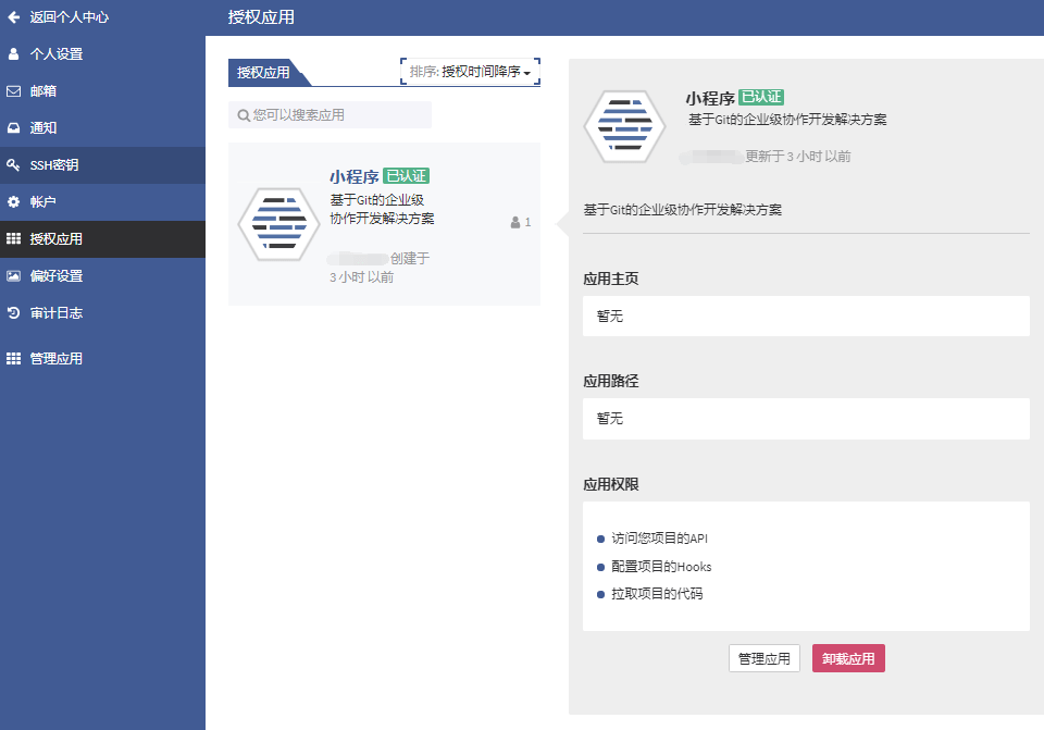 授权应用列表的右侧是应用的具体信息,点击 授权应用 或者列表中应用的名称,进入到授权应用的详情页面,如下图所示: