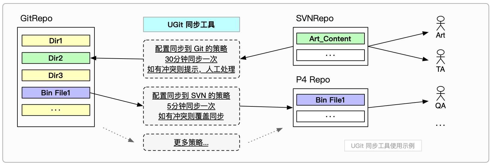 UGit 同步工具支持 Git/SVN/P4 三种类型工具中任意两者间的同步,满足业务团队对不同研发工具场景的使用需求。