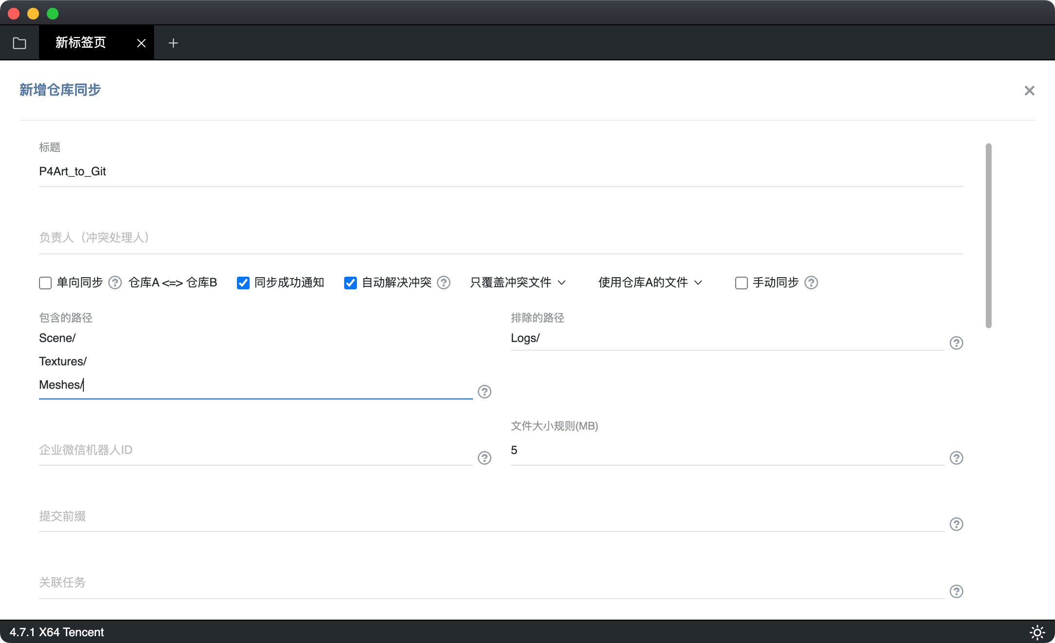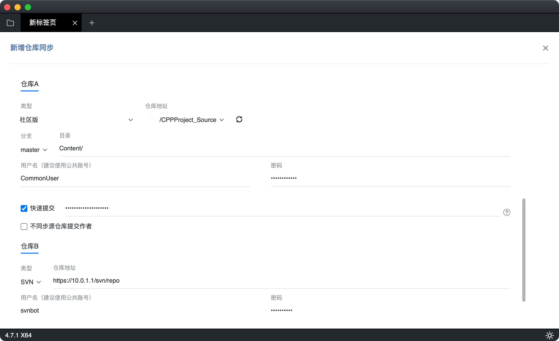 是指同步的双方仓库,选择Git/SVN/P4仓库,并配置相关的授权、目录、编码等信息即可: