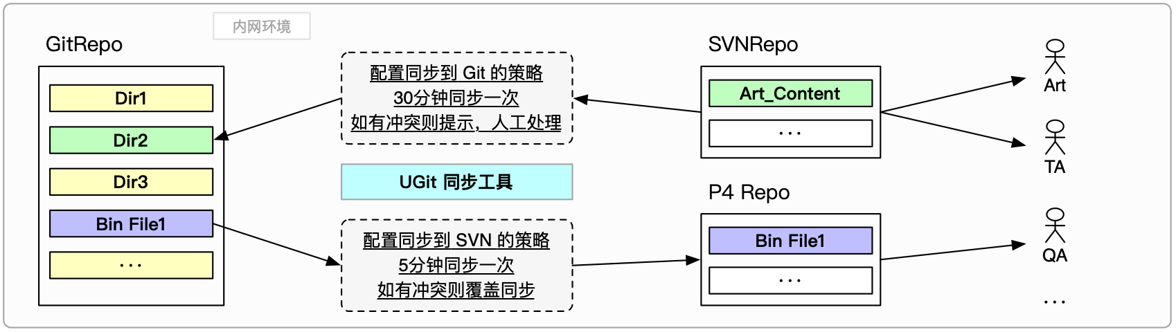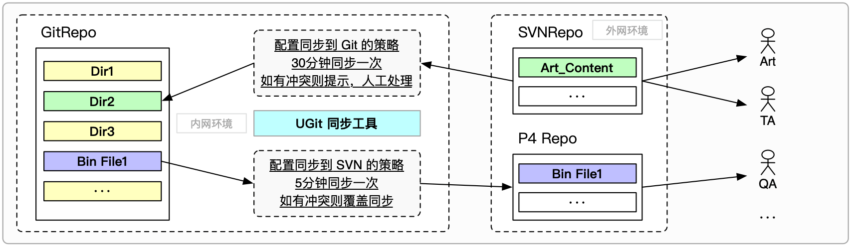 - 外部合作商产出的大量模型、纹理贴图、场景等资源,需要同步到内部项目进行使用