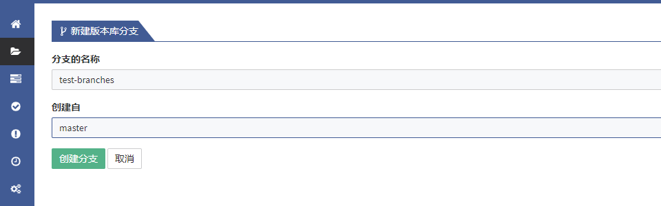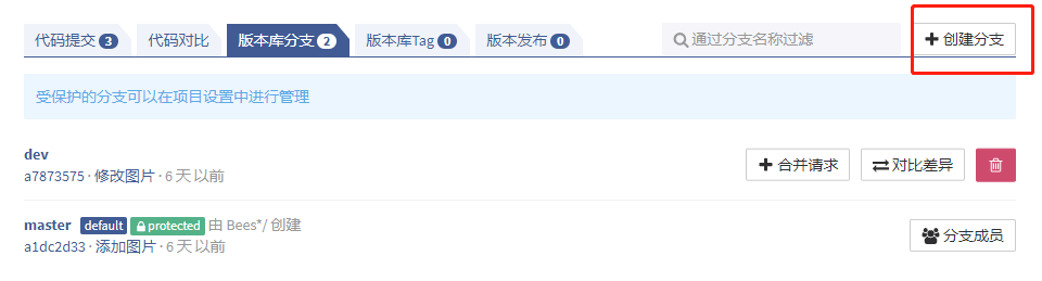 进入一个项目点击左侧导航栏的版本库-分支,这是您会看到创建分支按钮,单击创建分支按钮。
