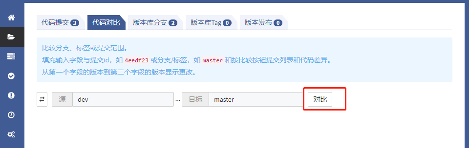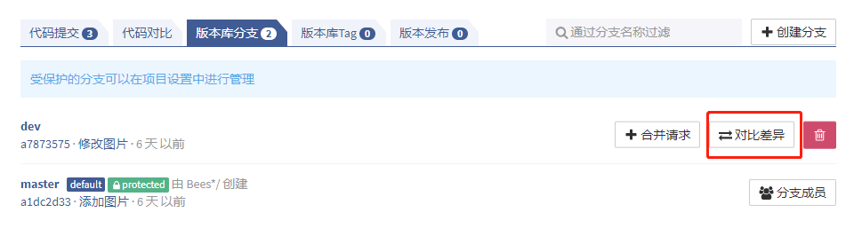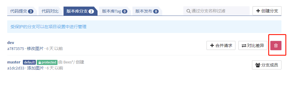 进入一个项目点击左侧导航栏的版本库-分支,进入到以下界面。,然后点击的版本库分支,进入到以下界面。