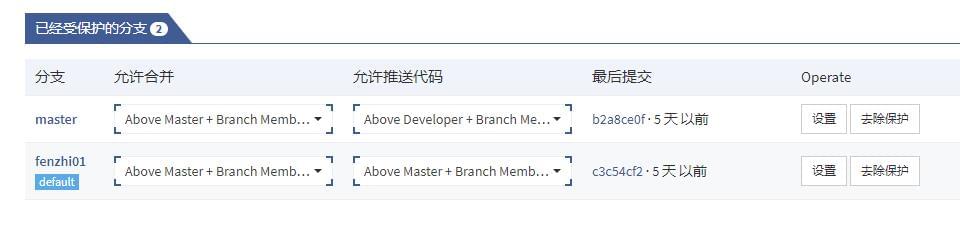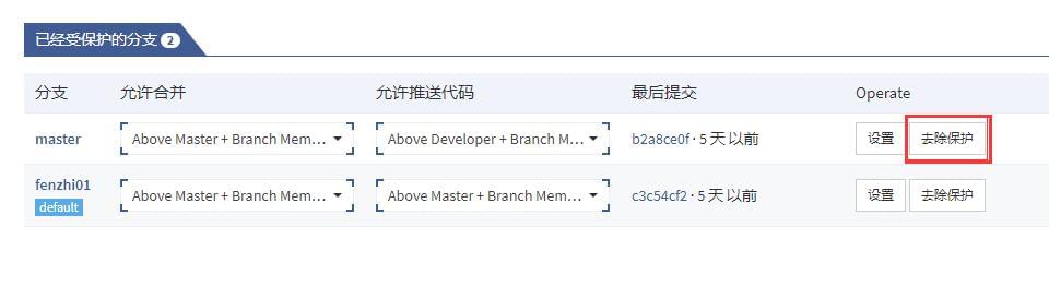进入刚才的保护分支页面,在最下面我们可以看到已经受保护的分支,点击设置。