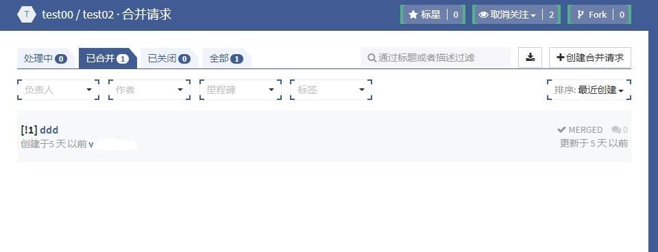 进入一个项目然后点击左侧的合并请求,接着点击右边上方的已合并,