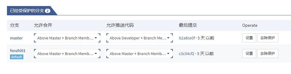 完成之后,受保护的分支会出现在保存变更下方的已经受保护的分支
