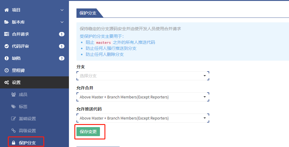 然后从分支下拉菜单选择您要保护的分支,单击保存变更。