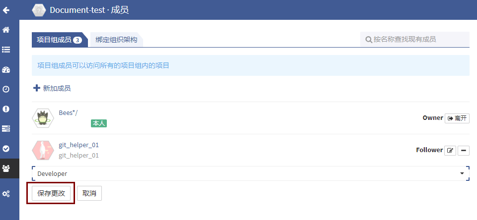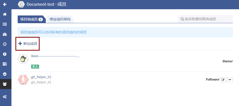 导航至您的项目组-选择一个项目组-成员,然后点击添加成员