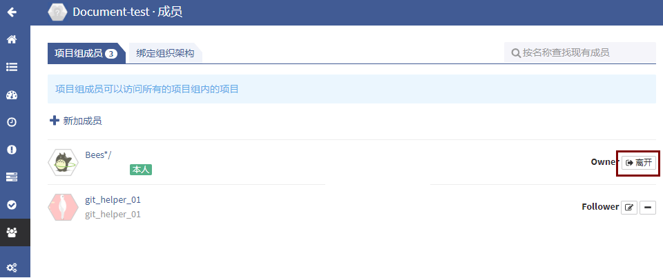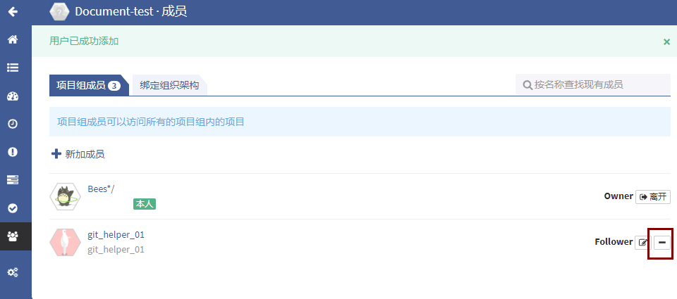 导航至您的项目组-选择一个项目组-成员,找到要移除的成员点击"-"按钮