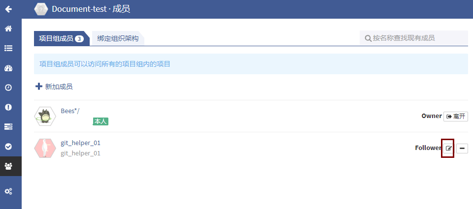 导航至您的项目组-选择一个项目组-成员,找到要修改权限的成员点击红色打框的图标