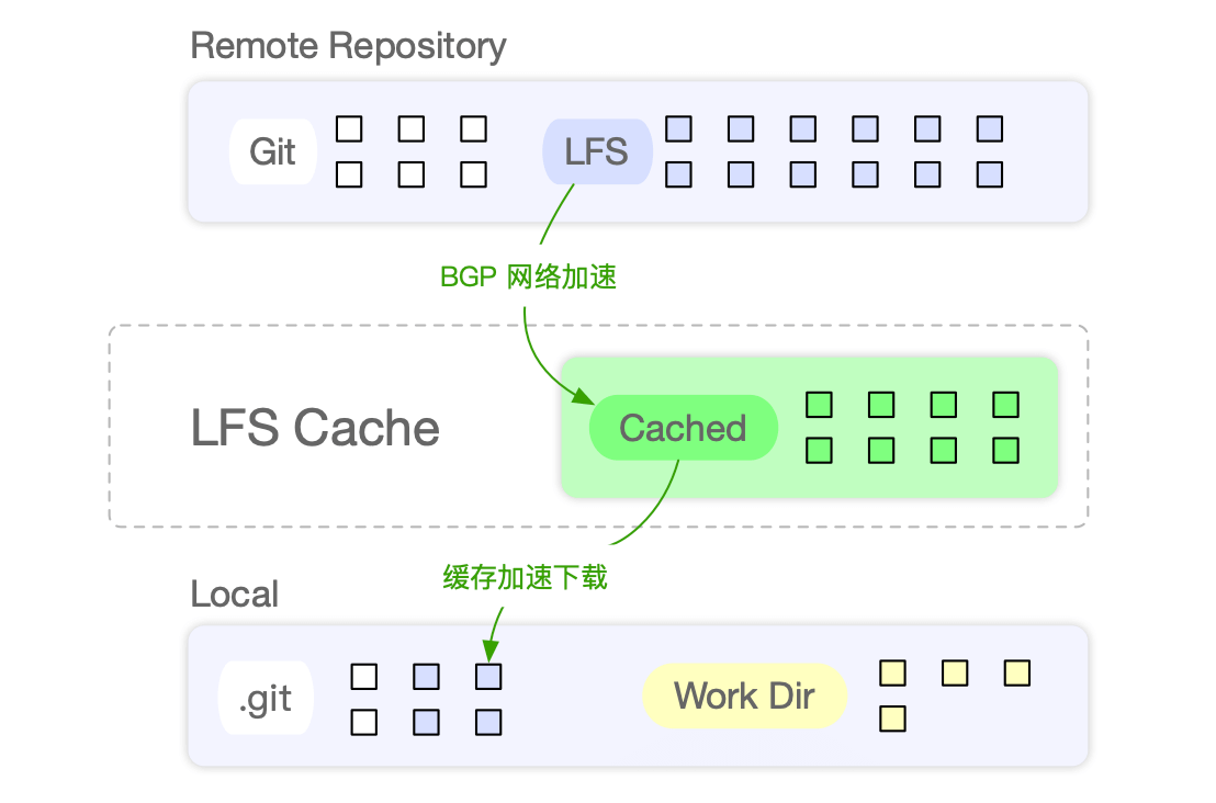 LFSCache 是一个 Git LFS 的加速工具,通过缓存 LFS 对象到局域网,可以有效的提升域内其他用户的下载速度, 这在一些包含大量 LFS 二进制文件的场景中尤为有效,比如游戏研发、创新数字产业等场景。,比如在游戏场景下, 大量的资源文件采用 LFS 进行管理,下载的时候就会导致办公场地带宽吃紧,使用 LFSCache 即可实现将 LFS 对象缓存到局域网内, 下次下载的时候就可以优先从内网拉取,避免频繁的拉取对带宽造成的压力,也能提升拉取的速度。