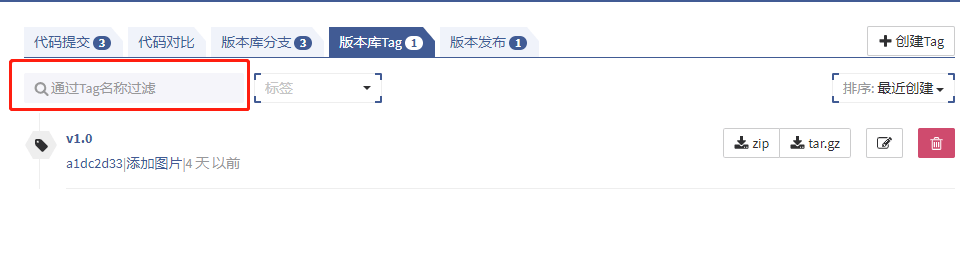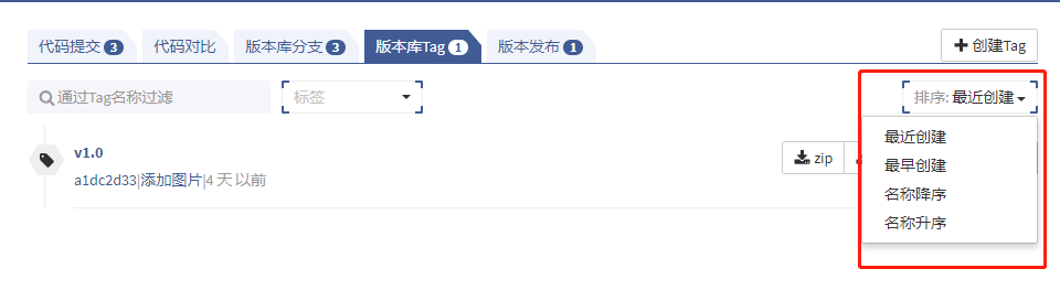 导航至项目-选择一个项目-版本库-提交-版本库Tag,点击排序下拉框,然