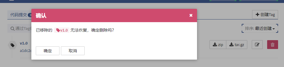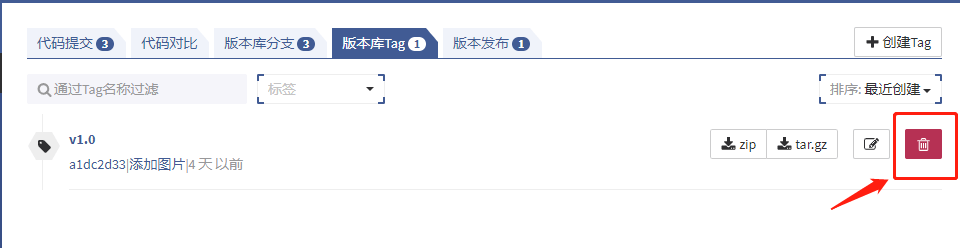 导航至项目-选择一个项目-版本库-提交-版本库Tag,点击 +创建Tag 按钮,