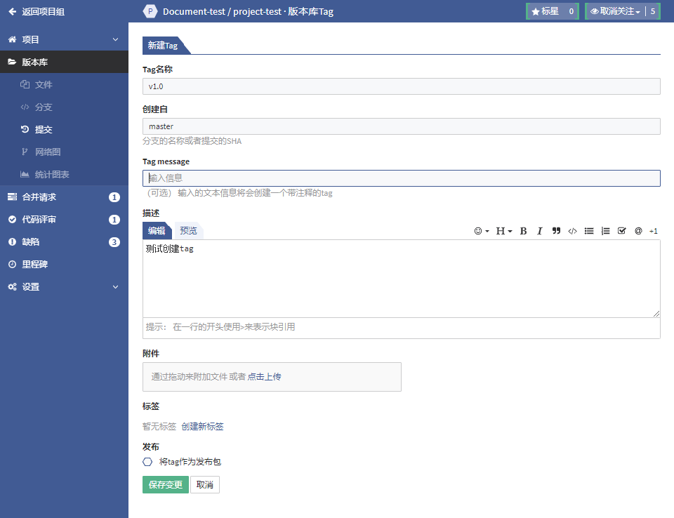 根据提示输入Tag名称、创建自以及描述、添加附件、标签,然后点击保存变更 即可。