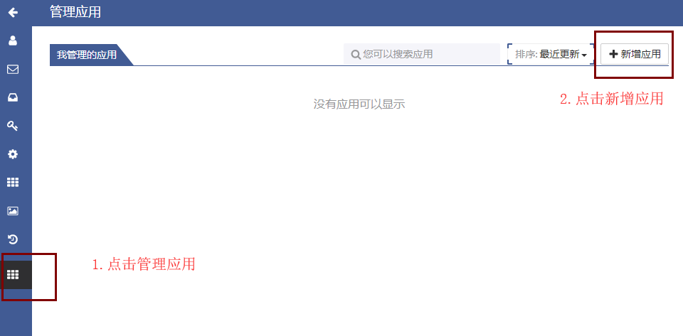 开发者从侧边栏 导航到个人设置-->管理应用,点击右上角的 新增应用 创建属于自己的一个应用。