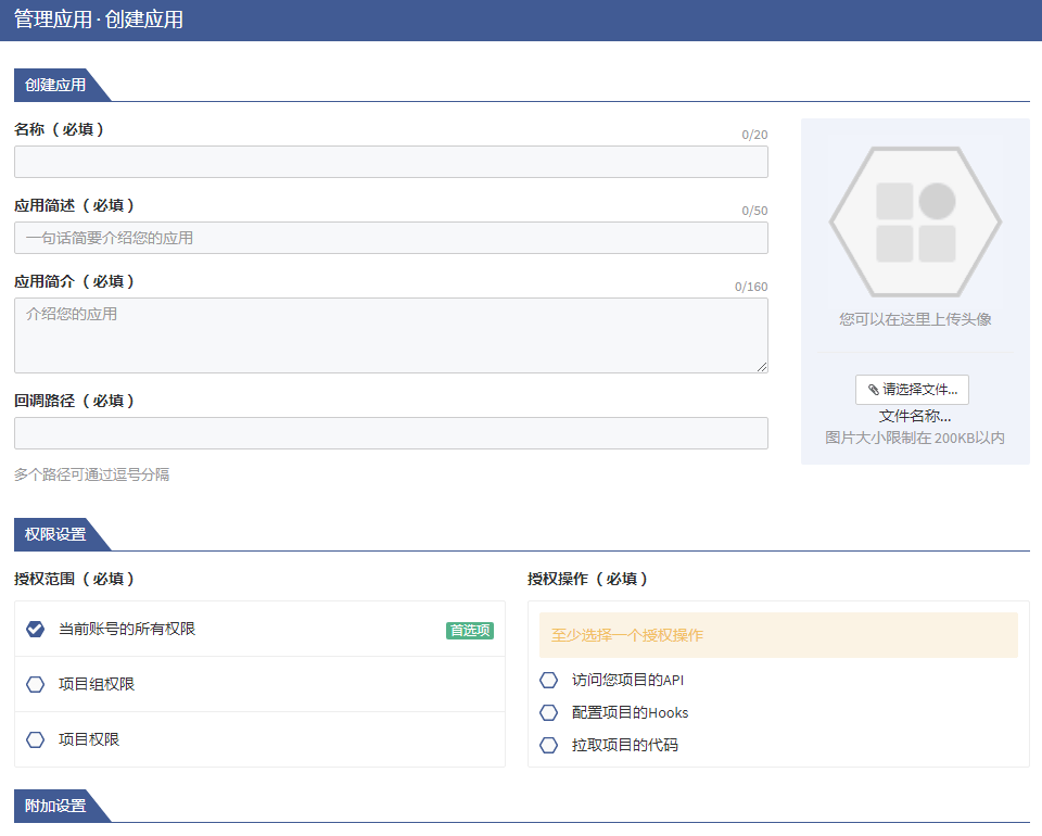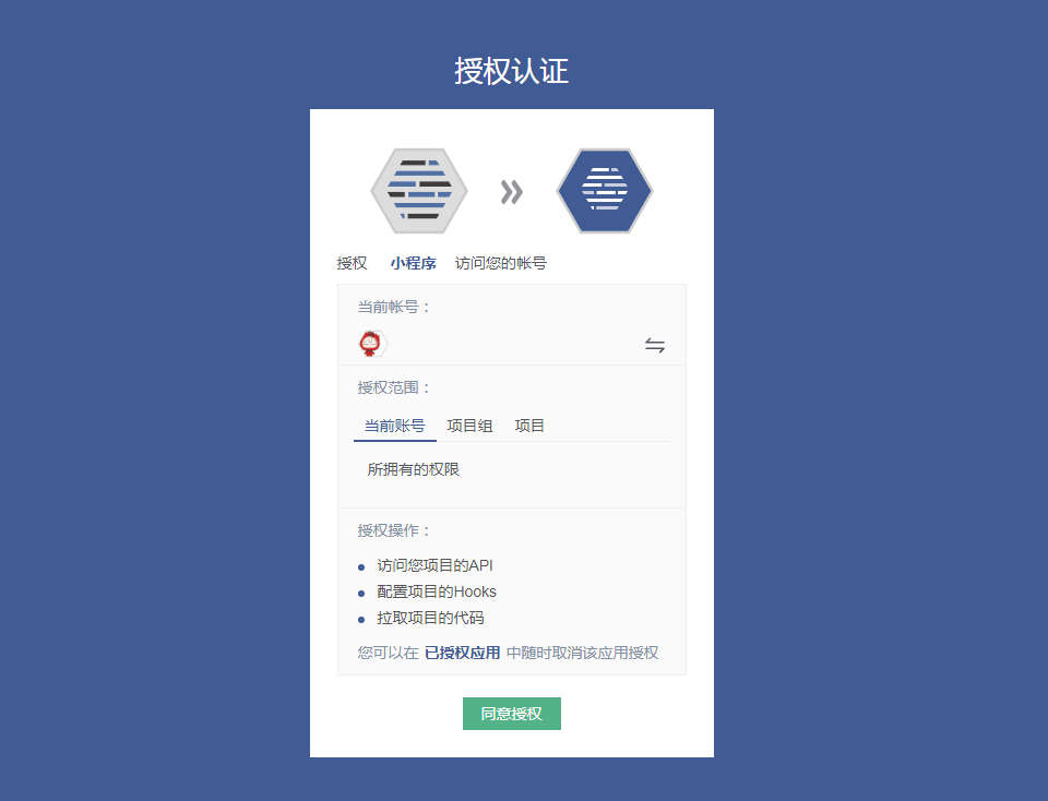 平台分别提供了用户、项目组、项目等三个依次递减的范围以及API、Hooks、拉取项目的代码等授权操作。开发者可以在此基础之上进行勾选来确定获取用户在平台上的哪些数据和信息。