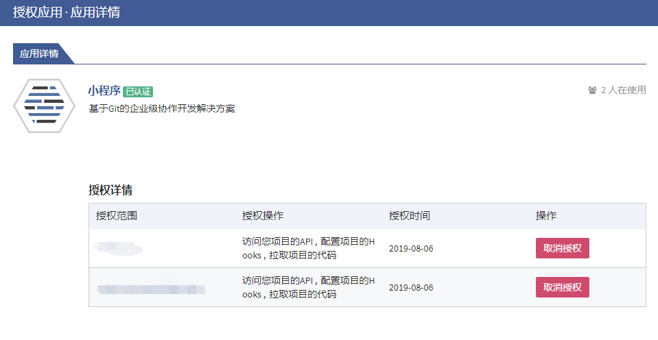 每一个平台用户可以对同一个应用进行多次授权,用户在授权应用的详情页面中可以看到在当前应用中授权列表。同时,在授权详情列表中,用户可随时取消某次授权。