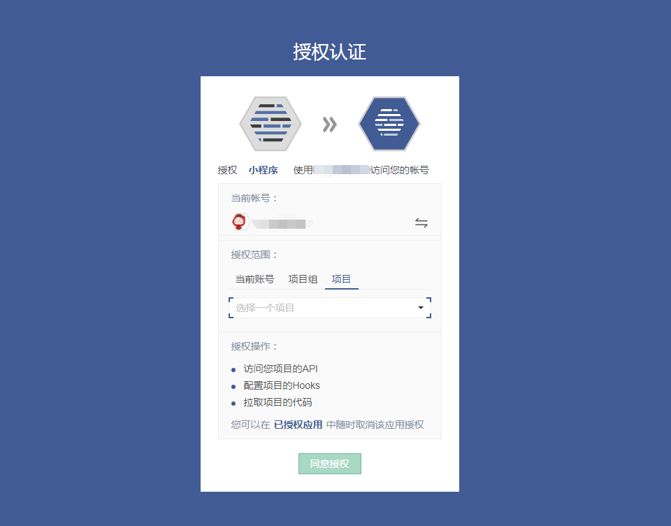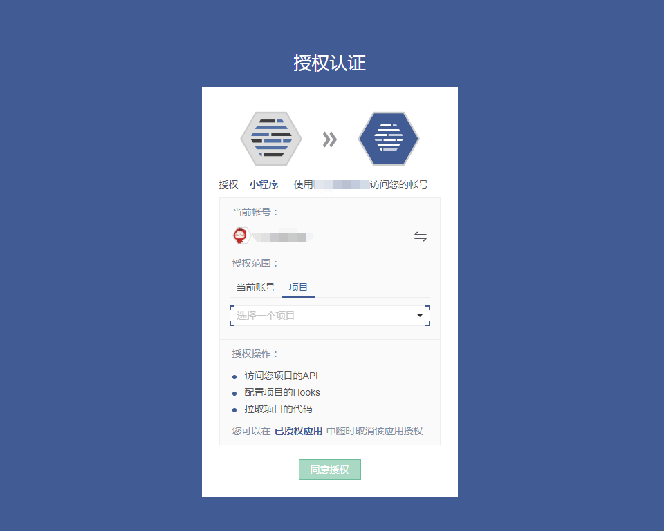根据开发者在创建应用时选择的授权范围,在上图中,平台用户只能在当前帐号和 项目 之间进行选择。由于开发者选择的授权范围首选项是 项目,因此用户会优先在项目下的下拉框中,选择具体授权到哪一个项目。