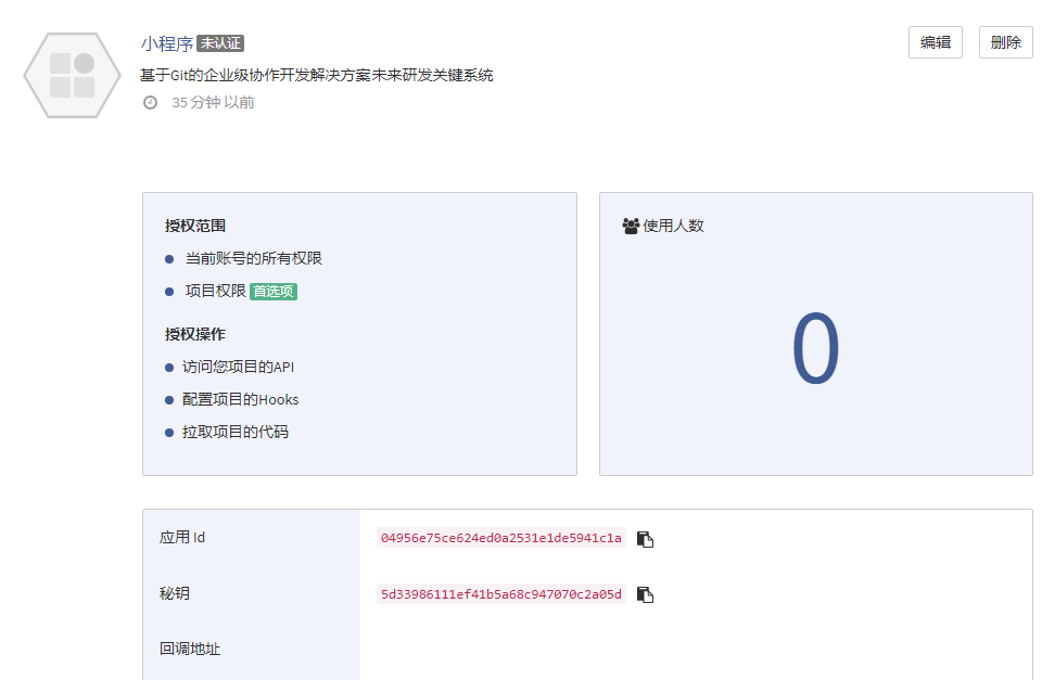 在应用详情页面的右上角,提供了编辑应用和删除应用的入口。考虑到操作的便捷性,在页面的应用ID 、秘钥以及回调地址展示区域,增加了一键复制的功能。