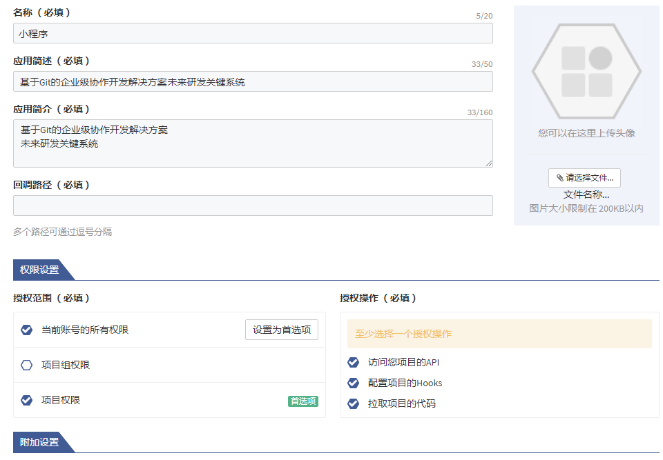 例如:开发者在创建应用的过程中,选择的授权范围是:当前帐号的所有权限以及项目权限, 并且选择的首选项是项目权限。选择的授权操作依次是:API、Hooks、拉取项目的代码。