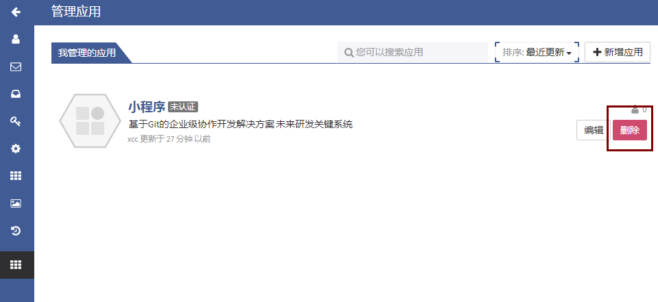 用户只能删除自身创建的应用,可以导航到 个人设置-管理应用,点击应用列表中最右侧的删除按钮,然后在弹出来的确认框中点击确认就删除此应用。