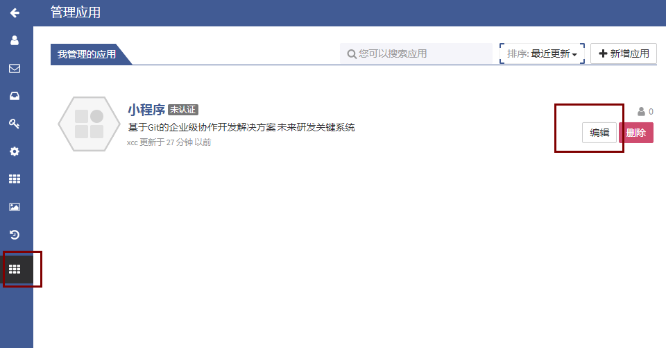 用户只能编辑自身创建的应用,可以导航到个人设置-管理应用,点击应用列表中最右侧的编辑按钮就可以进入编辑应用的页面。
