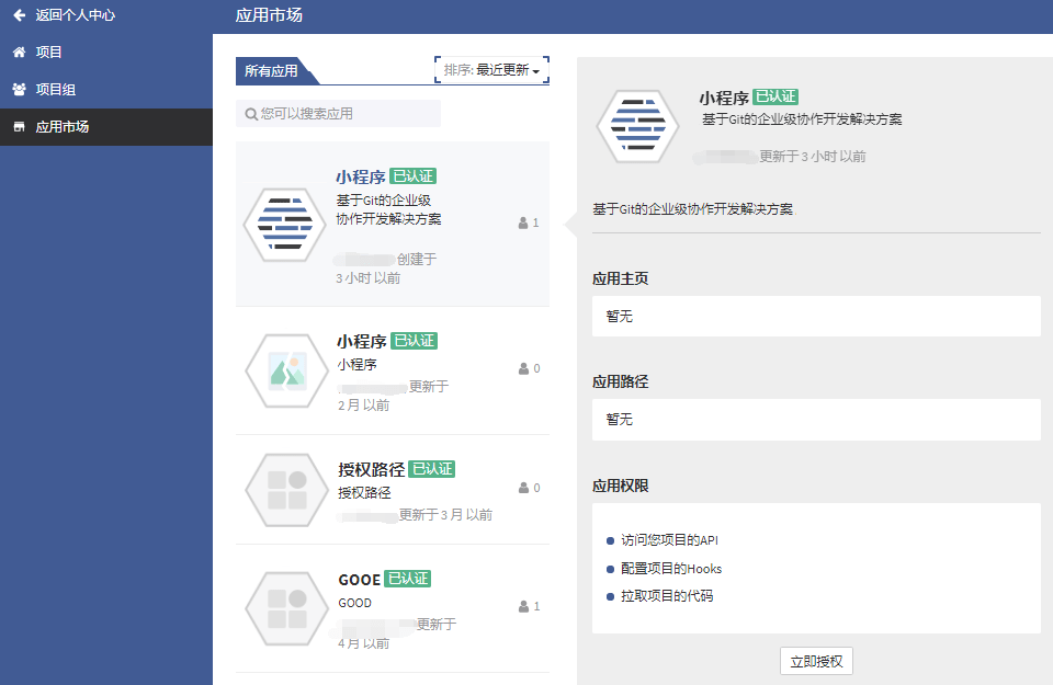 用户在应用市场中,可以对自己感兴趣的应用进行授权认证。通过以下两种方式,进入到平台Git的应用市场。
