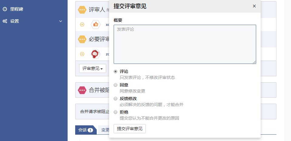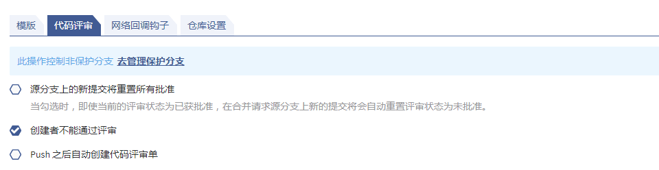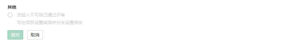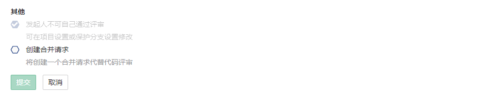 注意:上图中的其他选项表明,发起人不可自己通过评审。此设置当前页面不可修改,可以在项目设置的代码评审中或者保护分支设置里面修改。