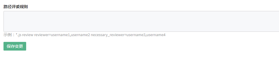 例如:*.js review reviewer=username1,username2 表示,匹配到后缀为js的文件有改动时,username1,username2本不是评委的,也会加到这个mr的评委中。