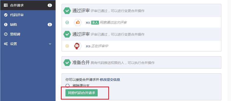 合并请求的状态会变成同意合并代码请求状态,这个时候可以将开发分支的修改合并到master上了。