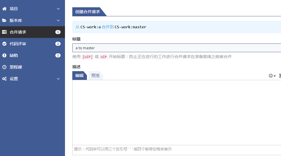 假设开发任务已经完成并且已提交到我自己的分支上,这时候我就可以来发起一个 MR 了。导航至项目-合并请求-创建合并请求。