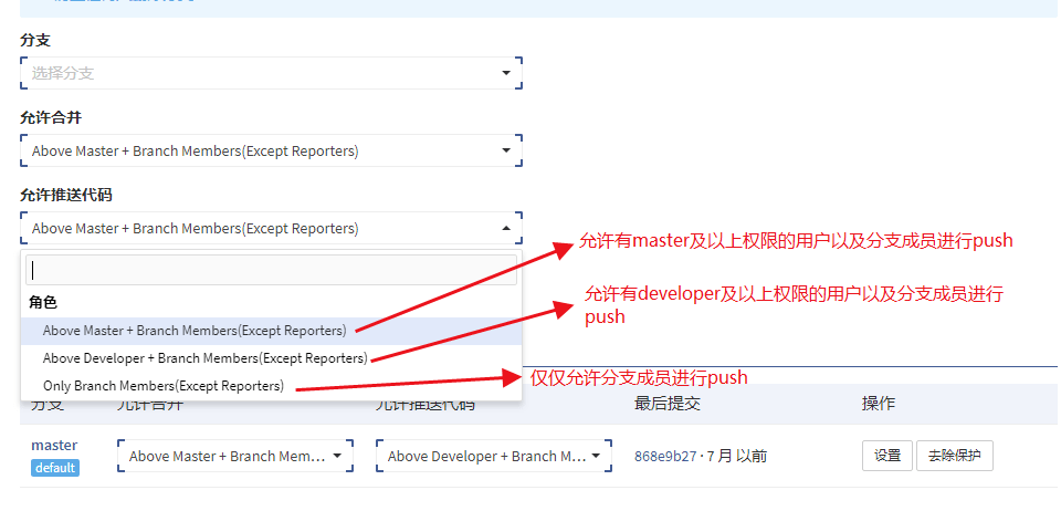 Branch member 需额外配置,配置方法可参考文档中的保护分支成员设置内容。(这些权限都需要去除分支成员中的repoter)