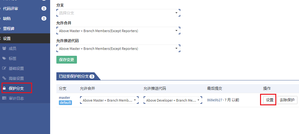 进入到项目设置的保护分支页面,选择一个已经受保护的分支,点击后面的设置