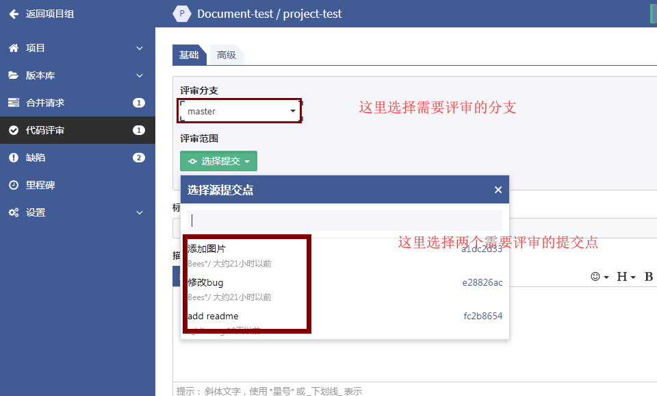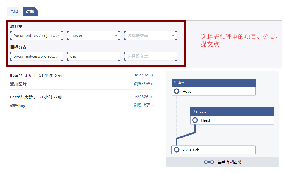 高级评审提供源项目、源项目分支、源项目分支提交点和目标项目、目标项目分支、目标项目分支提交点的选择,同时源项目和目标项目都可以是当前项目fork的项目,非常灵活。