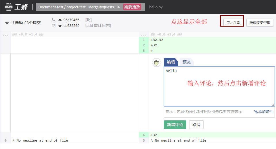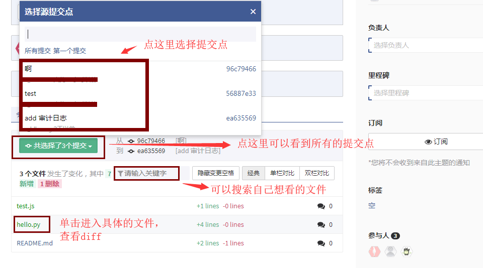 注意:此时比较是源提交点与目标提交点之间的文件,目前使用的三个点的对比,也就是git diff a...b。 不过由于现在是同一个分支,此时选择的两个提交点对比,底层其实也是直接对比这两个提交点的文件。