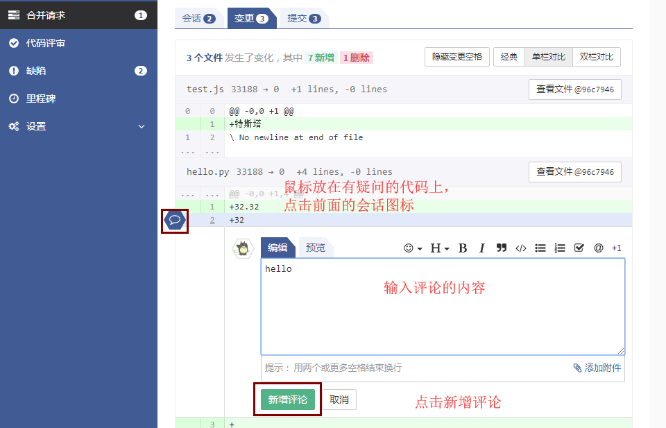 请求更改:表明评审人需要评审创建者再次修改代码,可以重新打开(reopen)把状态变成评审中状态。