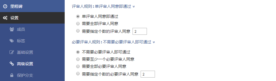 下面以保护分支的设置为例,非保护分支的设置入口在 项目设置-高级设置-代码评审。
