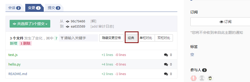 相对与单/双栏模式来讲,经典模式多了可以搜索文件、选择只看某两个提交点之间的diff、查看diff上下文等功能。